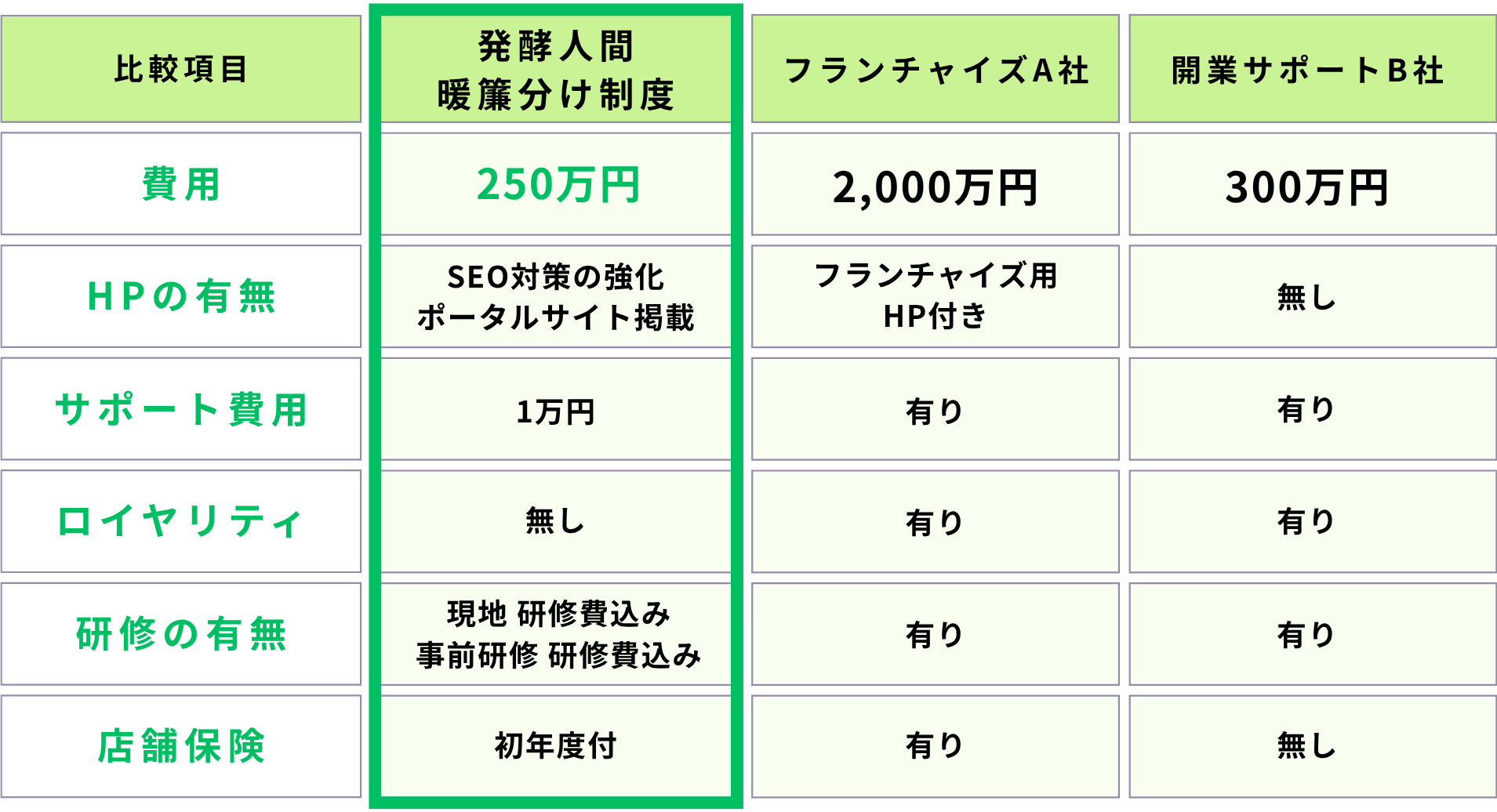 発酵人間の暖簾分け制度は、0次募集であるため、他社と比較しても非常に内容が充実しています。